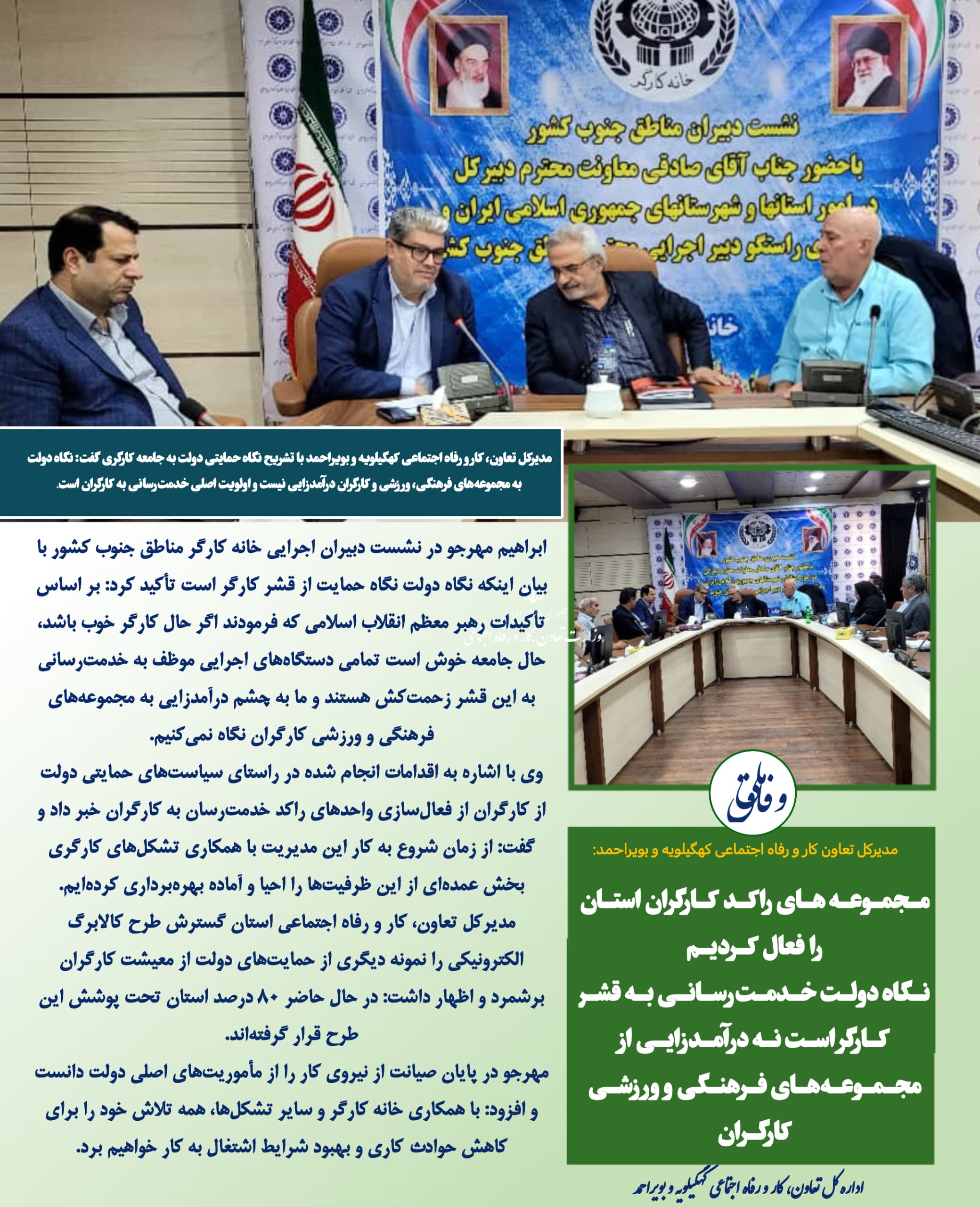 مدیرکل تعاون، کار و رفاه اجتماعی کهگیلویه و بویراحمد با تشریح نگاه حمایتی دولت به جامعه کارگری گفت: نگاه دولت به مجموعه‌های فرهنگی، ورزشی و کارگران درآمدزایی نیست و اولویت اصلی خدمت‌رسانی به کارگران است.