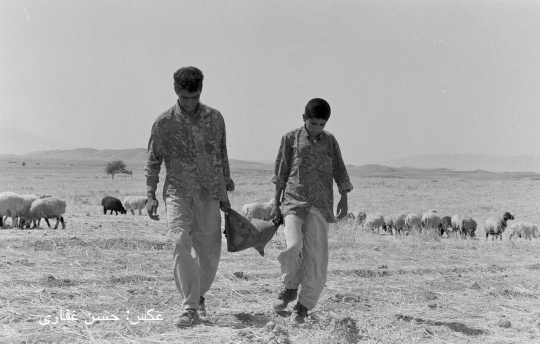 «جایگاه پتروشیمی کنونی دهدشت، دو چوپان مشک ابی را حمل می کنند. 1376»