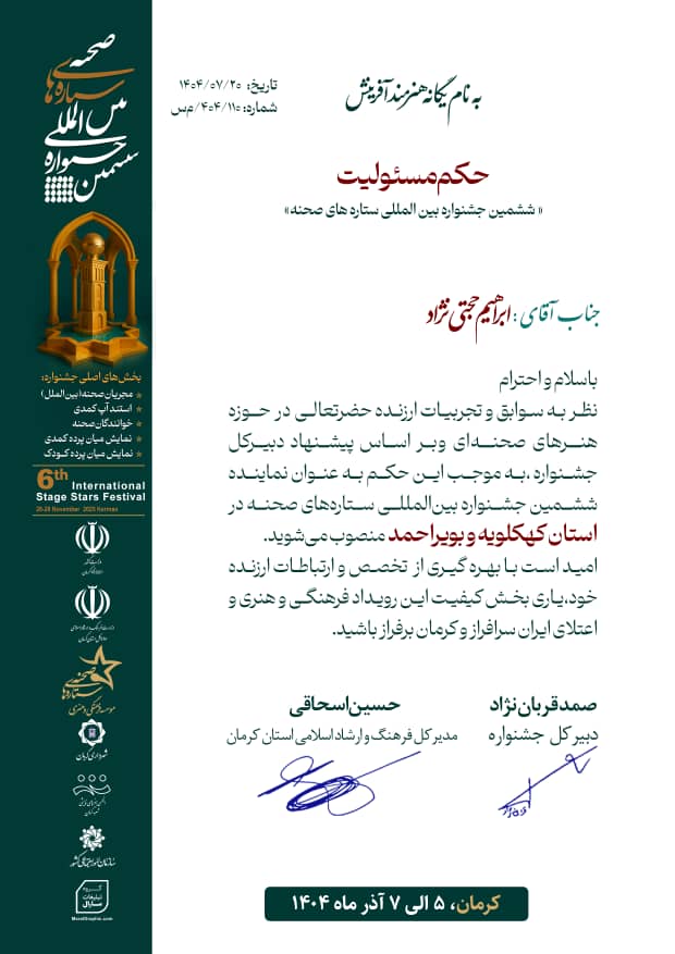 شایان ذکر است بر اساس پیشنهاد دبیرکل جشنواره ابراهیم حجتی نژاد فرهنگی و هنرمند استان کهگیلویه و بویراحمد به عنوان نماینده ششمین جشنواره بین المللی ستاره های صحنه در استان کهگیلویه و بویراحمد منصوب شدند .