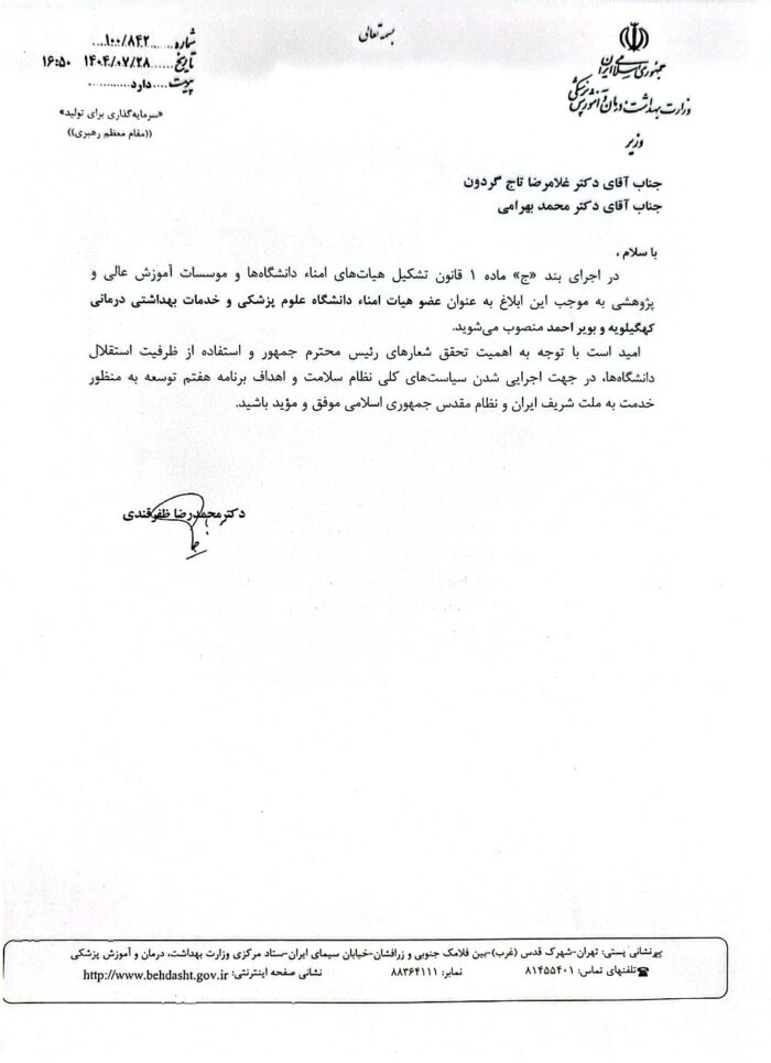 صدور حکم وزیر بهداشت برای غلامرضا تاجگردون و محمد بهرامی در هیئت امنای دانشگاه علوم پزشکی یاسوج